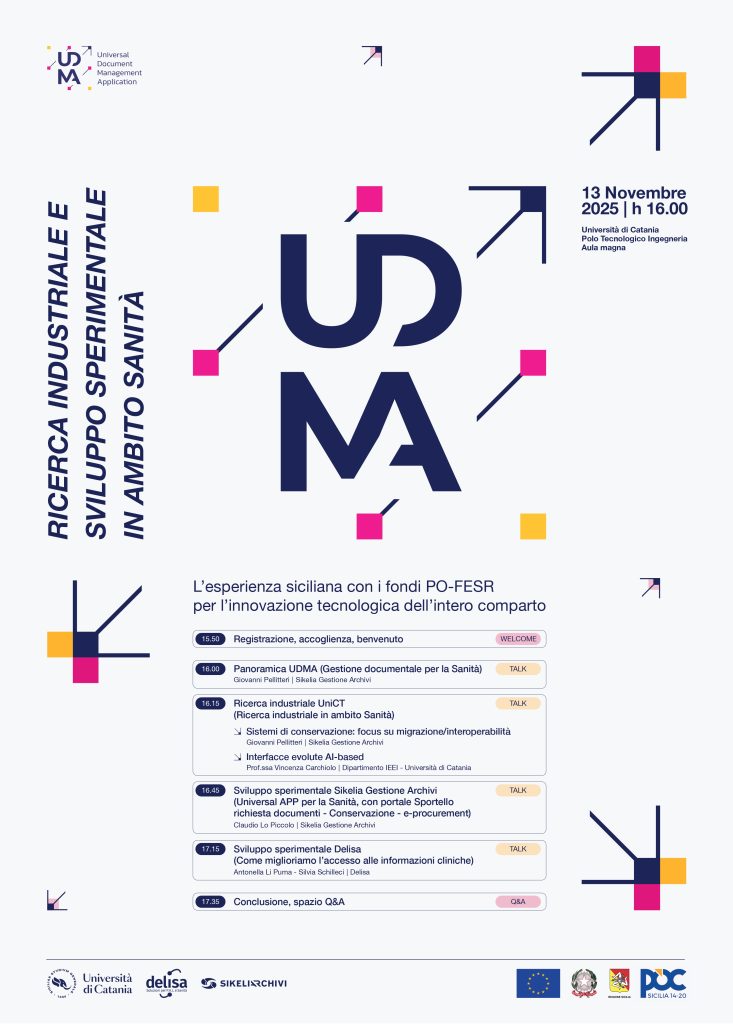 Il 13 novembre 2025 Delisa ha partecipato all’evento conclusivo del progetto UDMA – Universal Document Management Application, ospitato presso il Polo Tecnologico di Ingegneria dell’Università di Catania. L’iniziativa, finanziata dal PO FESR Sicilia, ha rappresentato un importante momento di presentazione dei risultati e di confronto sulle prospettive future della digitalizzazione dei processi documentali in ambito sanitario.